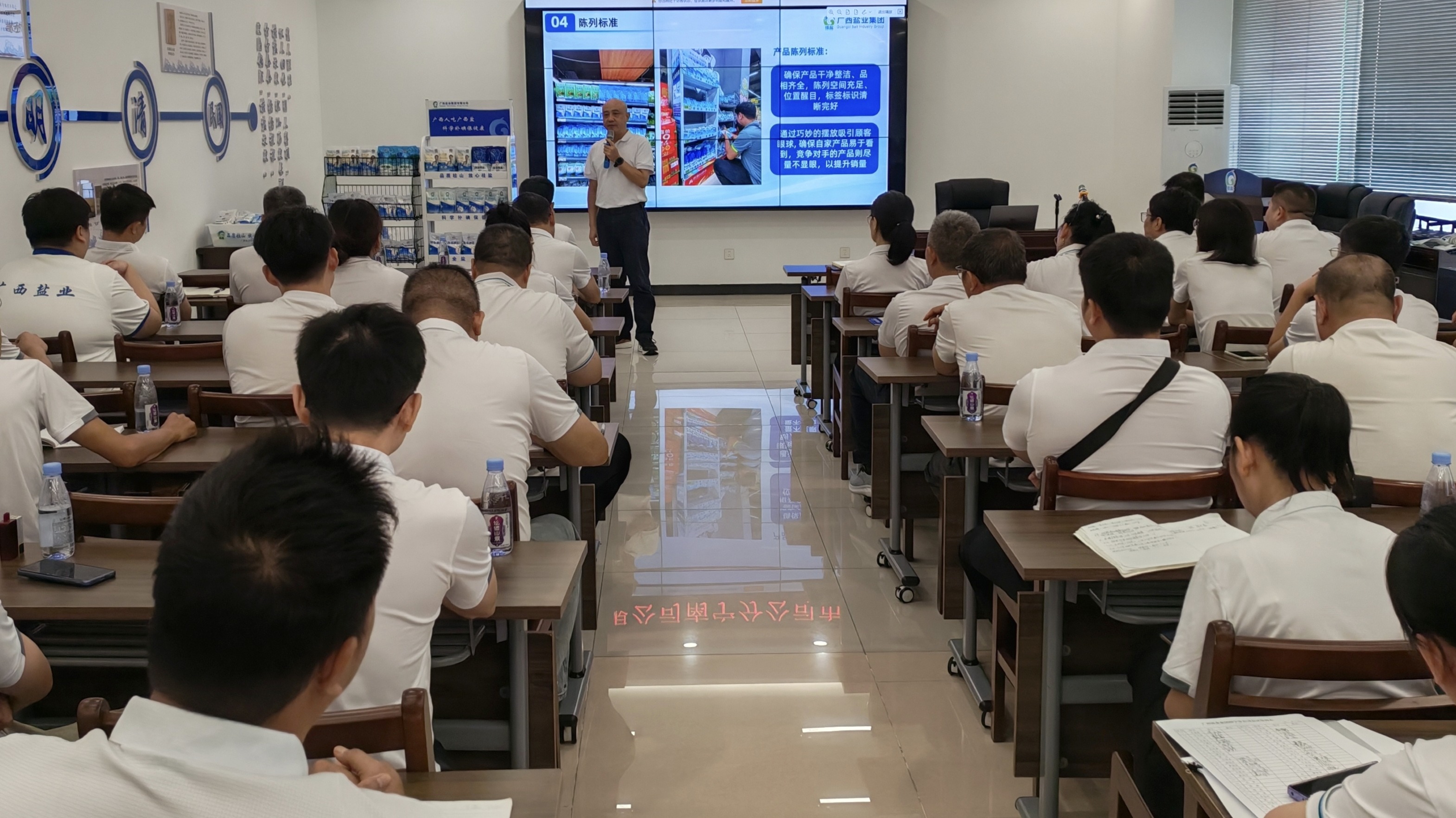 在专题培训环节,分公司优秀片区经理围绕四个方面分享实战经验,一是讲解如何利用大数据筛查、整理辖区内终端网点,并结合实地走访,收集客户基础信息;二是探讨与配送商共同做好客户洽谈准备工作,涵盖为客户选样及盐品促销技巧等内容;三是阐述如何灵活选用与客户洽谈的三种常见模式及表达合作价值的沟通技巧;四是结合实际案例,现场展示商超及其他流通渠道的盐品陈列动线设计、视觉焦点打造等技巧。